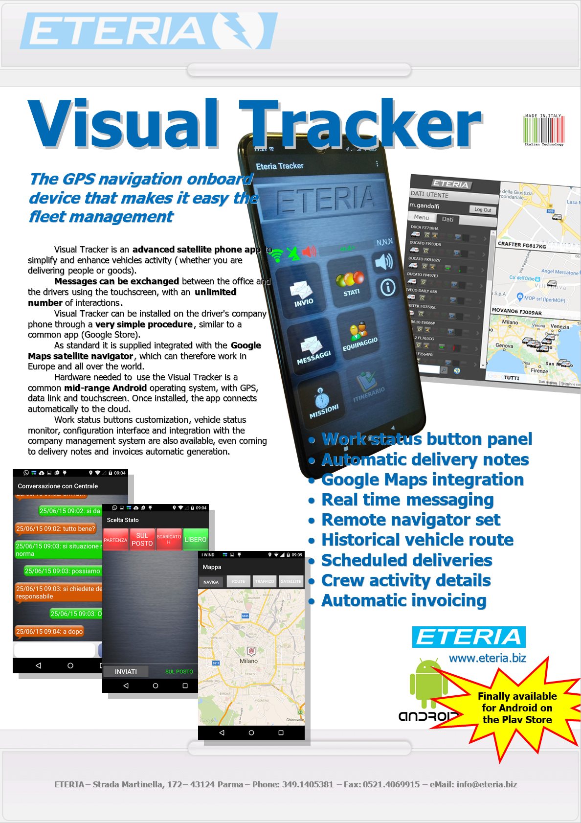 Visual Tracker is a powerful mobile on-board terminal, equipped with a professional satellite navigator and other relevant functions as real time tracking, automatic delivery notes and billing generation, and communication with the remote main office: messages, statuses, destinations, itineraries etc. Also available as an Android app, ideal for fleet management.