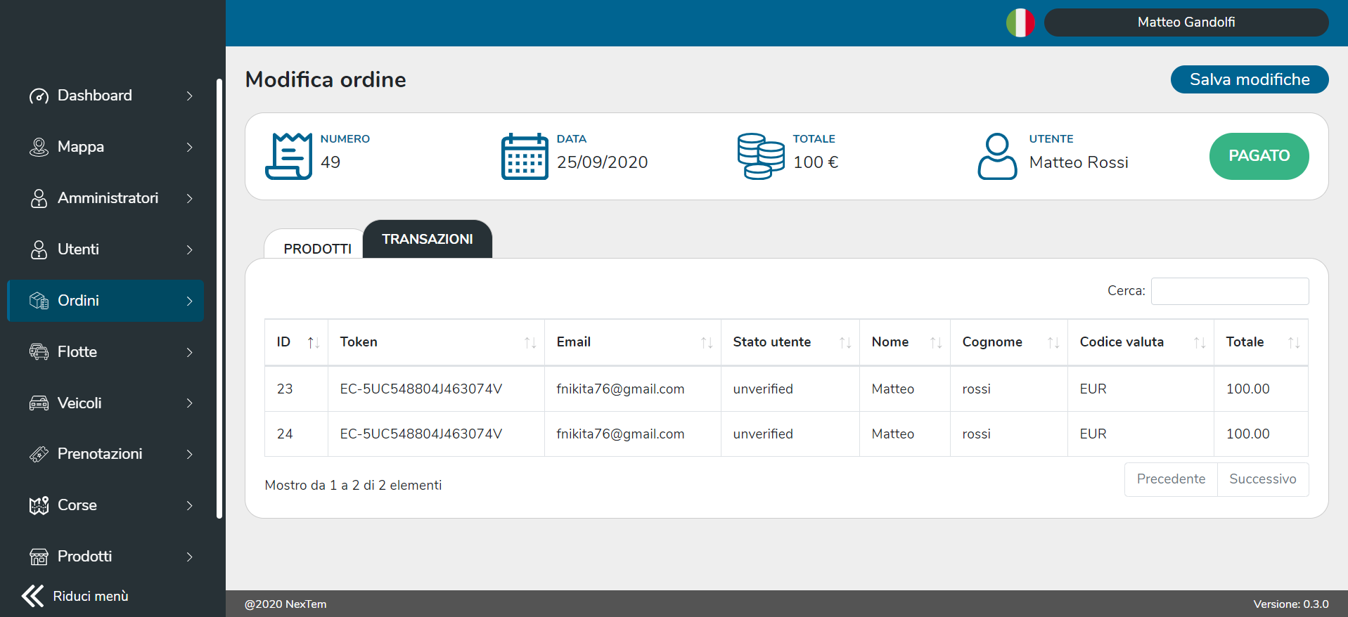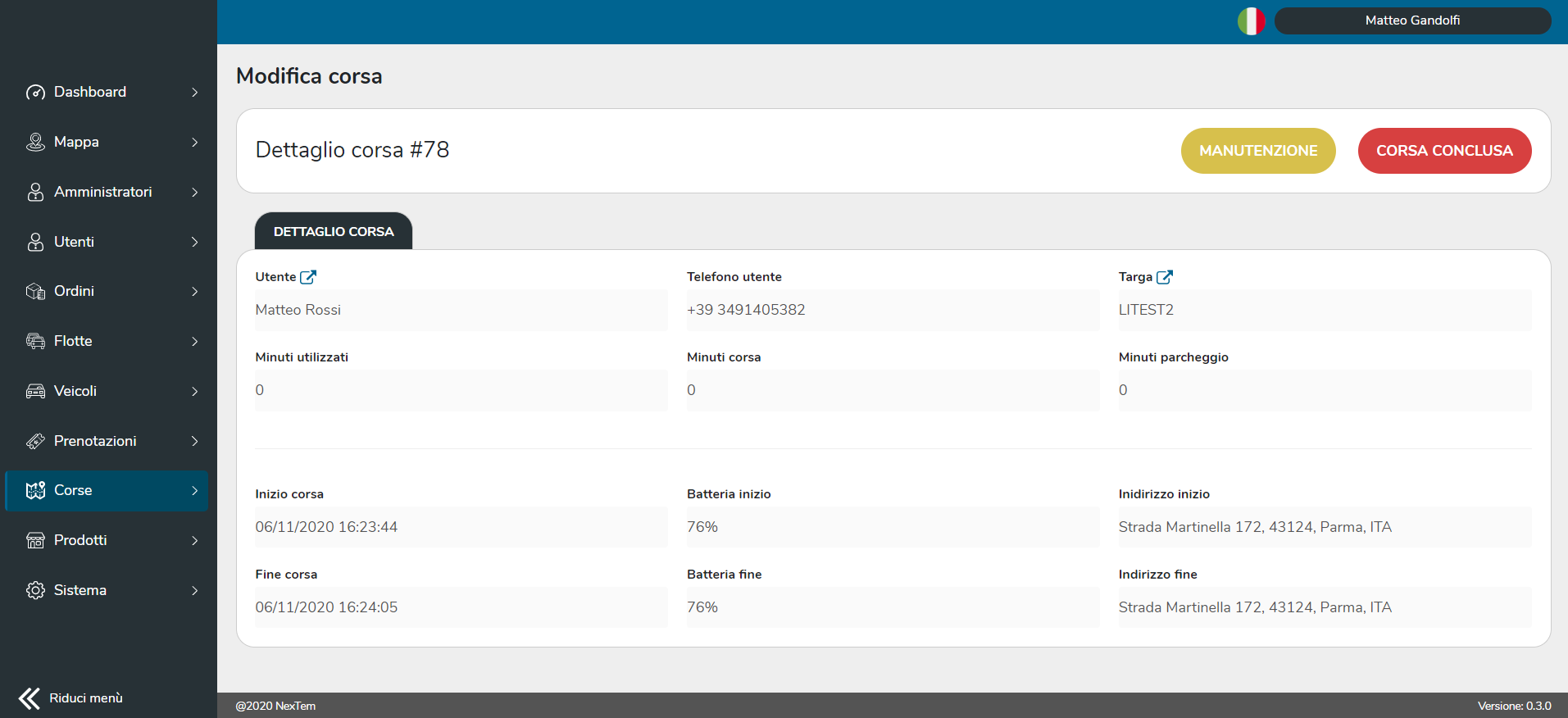 E’ disponibile l’elenco di tutte le corse fatte da auto collegate alla flotta, e per ogni corsa è possibile controllare quando è iniziata, dove, la fine, il costo e modificarne i dati.
