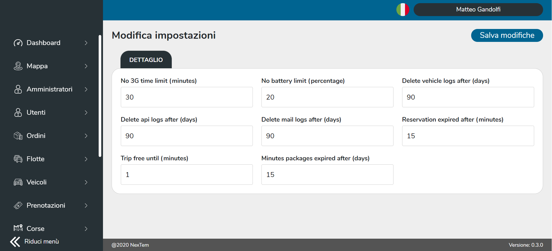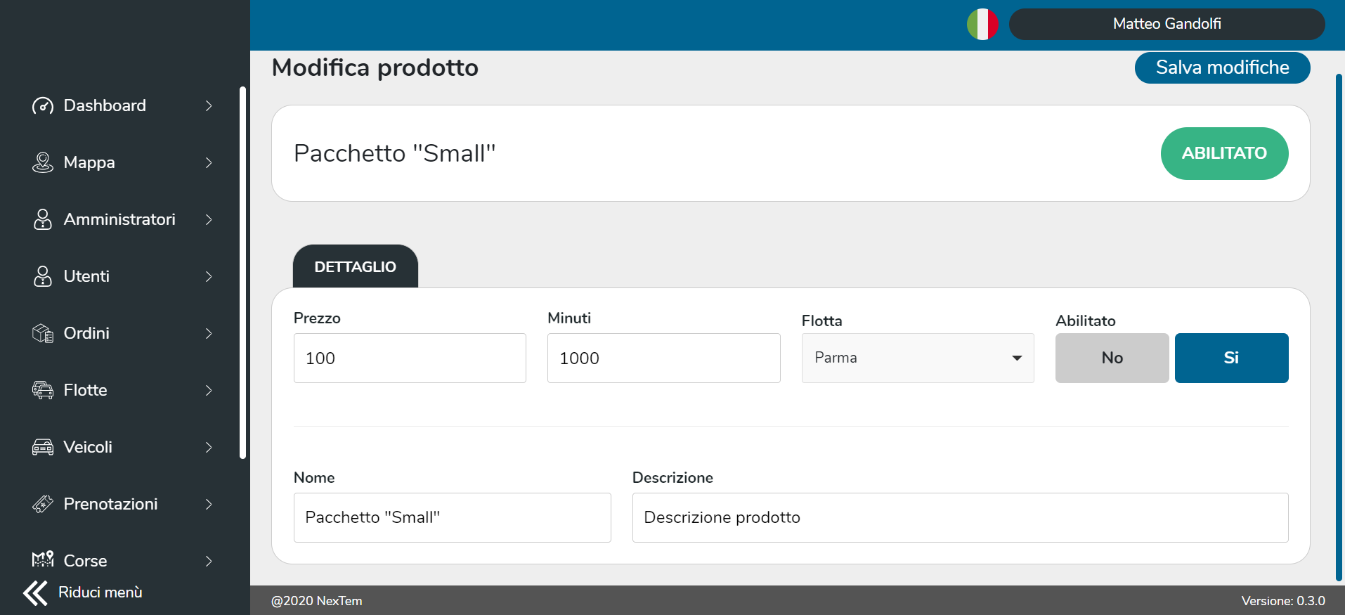 Ad ogni flotta possono essere associati dei pacchetti minuti configurabili dall’amministratore: questi pacchetti saranno visibili per l’acquisto in app da parte degli utenti di quella flotta. I pacchetti sono modificabili ed eliminabili.