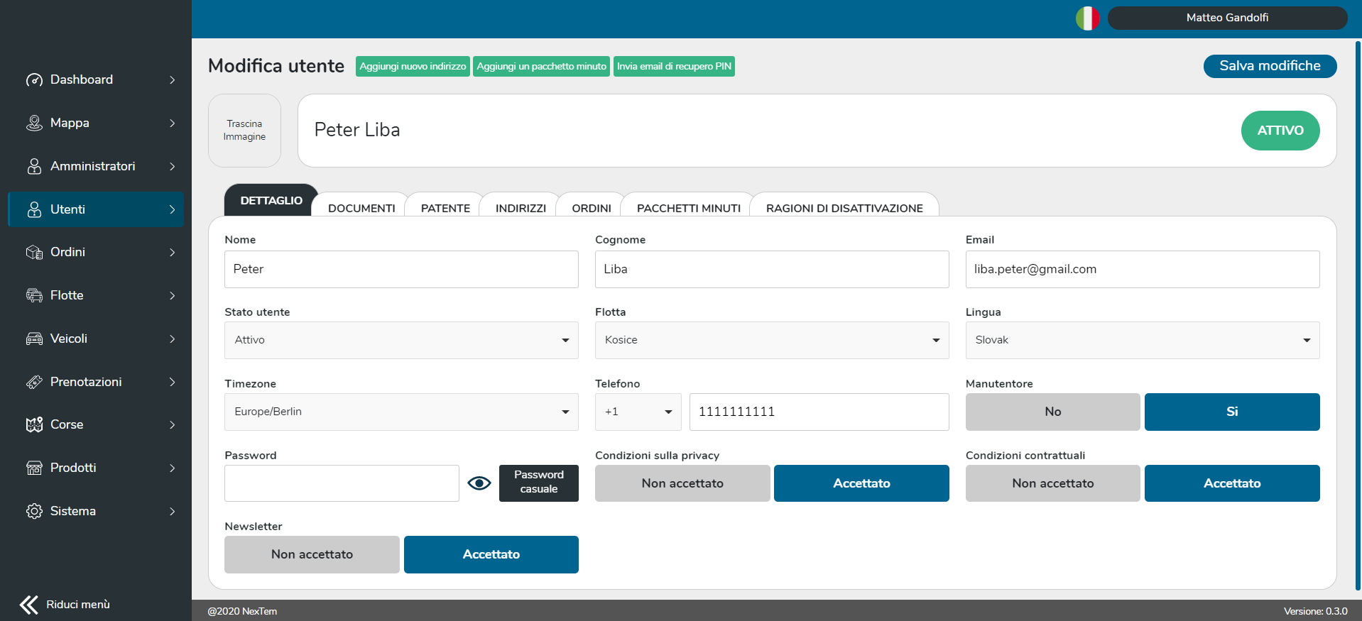L’amministratore della flotta ha accesso ai dati anagrafici di tutti gli utenti iscritti in quella flotta. Questi dati possono essere modificati e gli utenti attivati o disattivati.